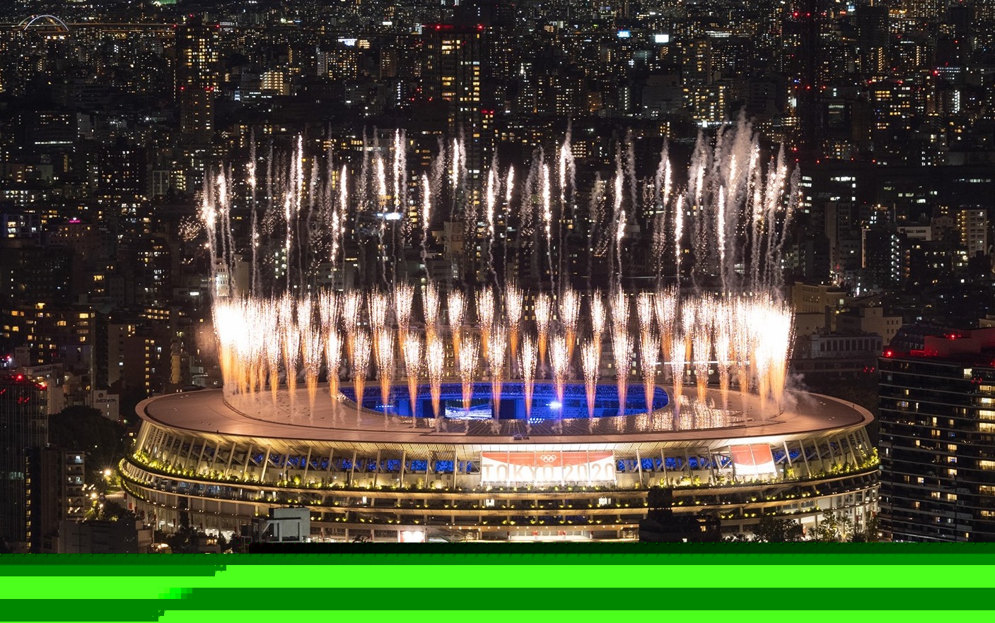 Pháo hoa rực sáng sân vận động Olympic cùng lời cảm ơn của nước chủ nhà trong lễ bế mạc Olympic Tokyo 2020. (Ảnh: Getty Image)