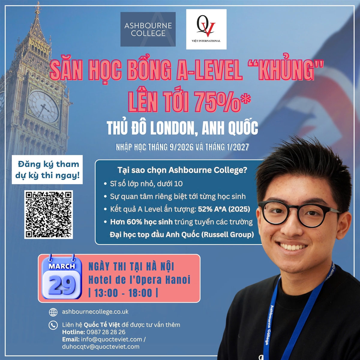 Nhằm mang đến cơ hội tiếp cận chương trình A-Level chất lượng cao tại Vương quốc Anh cho học sinh Việt Nam, Ashbourne College (London) phối hợp cùng Quốc Tế Việt tổ chức Ngày Thi Học Bổng A-Level tại Hà Nội: